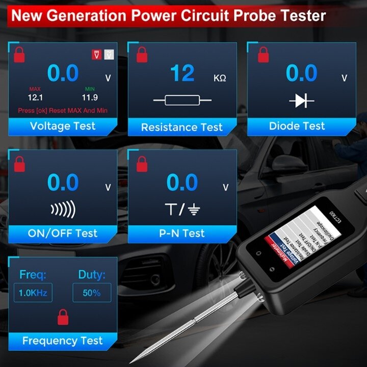 Víceúčelový tester/měříci přístroj automobilových elektrických obvodů slouží k širokému rozsahu autoelektrikářských prací.