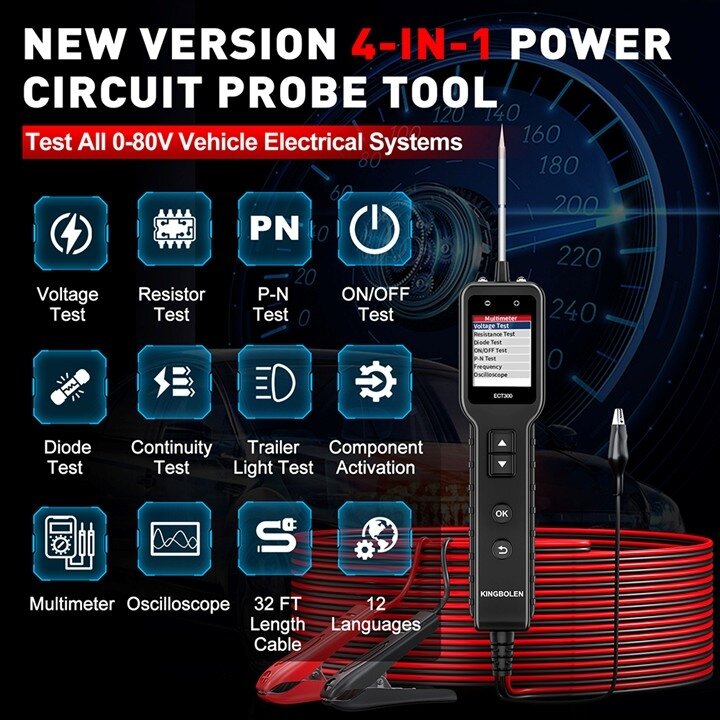 Víceúčelový tester/měříci přístroj automobilových elektrických obvodů slouží k širokému rozsahu autoelektrikářských prací. vynikající pomocník pro všechny autoelektrikáře a mechaniky. Umožňuje např.: - zkouška polarity - zkouška funkce součástí i před namontováním ( ventilátory, relé, palivová čerpadla, motory stahování oken, žárovky, atd..) - zkoušky průchodnosti (diod, spínačů, pojistek, kabelových svazků) - detekce zkratů, správného uzemnění, přerušených vodičů atd.) - měření napětí 0 - 80 V …