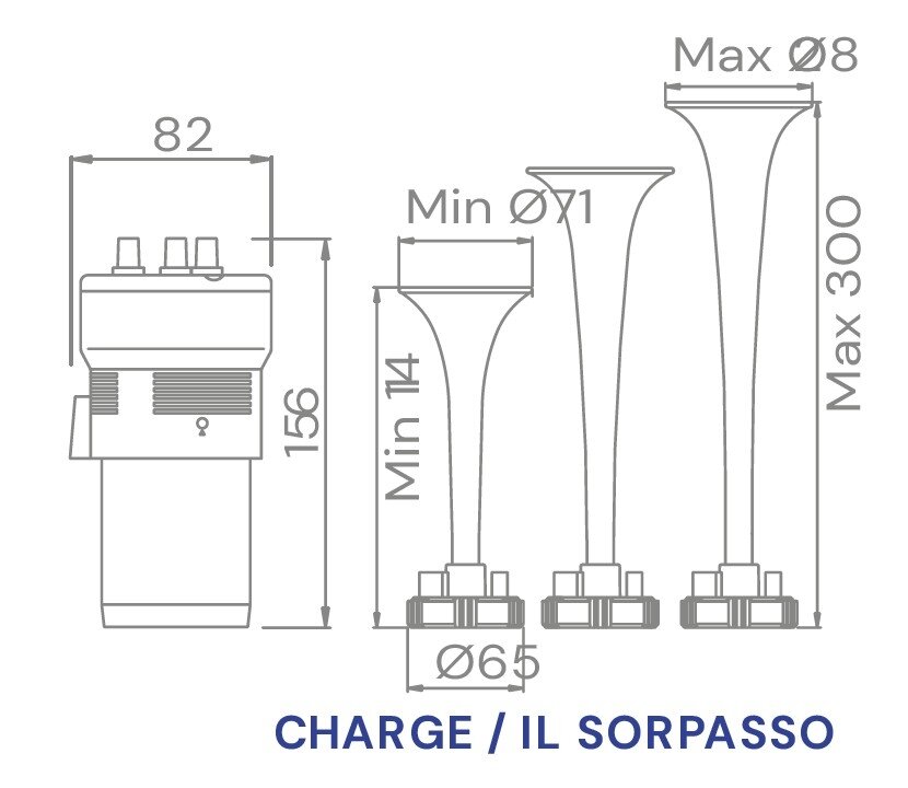 3-trubkové fanfáry poháněné vzduchovým kompresorem reprodukuje typický zvuk při předjíždění jako ve slavném filmu 60.let Sváteční vyjížďka (IL SORPASSO). Aftermarketová sada, k dispozici v blistru značky FIAMM, obsahuje vše potřebné pro instalaci. Souprava je určena především pro osobní automobily, motocykly a nákladní auta na 12 V.   Technické paramety - pracovní napětí: 12 V - napěťový rozsah: 11,5-13,8 V - absorbovaný proud: 17 A - vytvořený tlak: >0,45 bar - úroveň zvukového výkonu ve 2 metr…