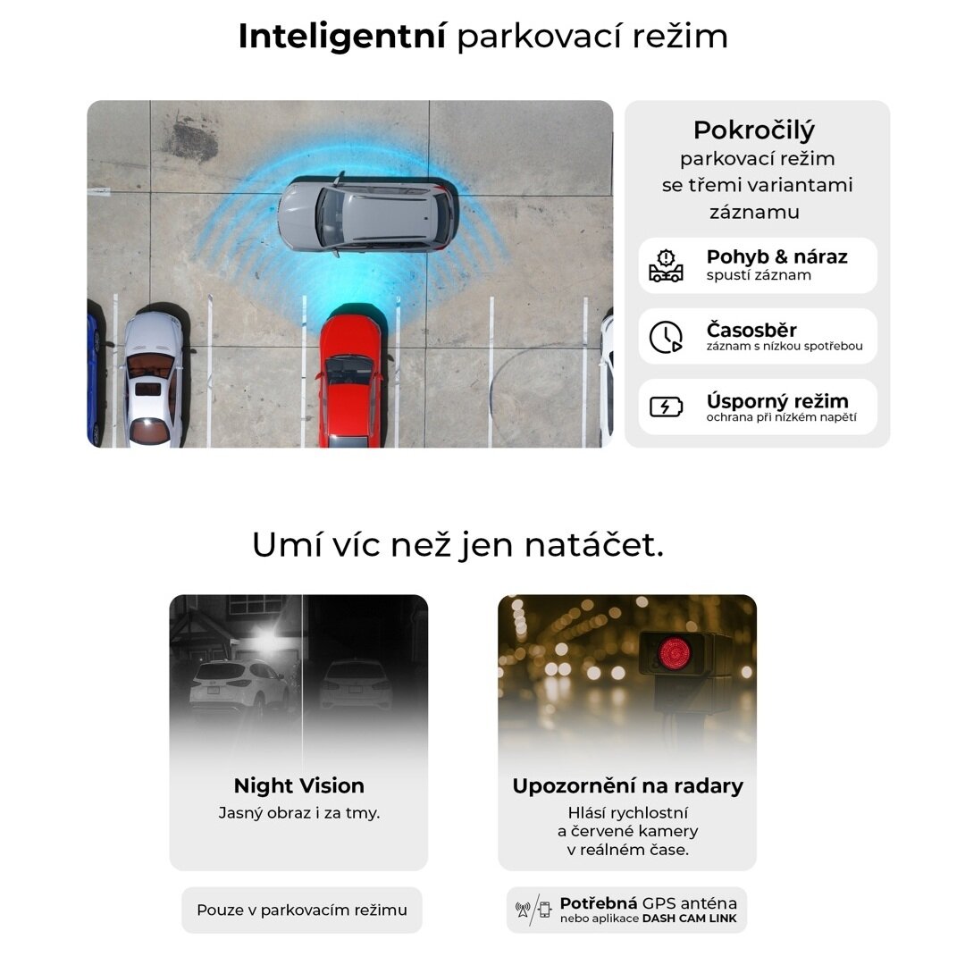 - Parkovací režim (detekce pohybu a nárazu, časosběrný režim a režim úspory energie)