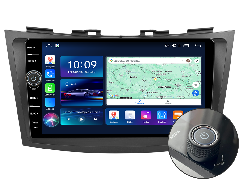 2DIN autorádio Everest EVE48 pro Suzuki Swift II (Gen 4) nastavuje nové standardy ve světě multimediálních technologií. Na první pohled zaujme svou 9 palcovou QLED obrazovkou s neuvěřitelným rozlišením 1280 x 800. Lze na ní sledovat video i prohlížet fotografie s podporou Android aplikacemi. O špičkový výkon a plynulý běh aplikací se stará stabilní software s 8-jádrovým procesorem ve spolupráci se 6 GB RAM. Náročný posluchač jistě ocení funkci DSP neboli digitální signálový procesor, který násobně zvyšuje kvalitu reprodukce. Za pomocí 4G modulu se z Vašeho autorádia stane smartphone, ze kterého můžete hravě odesílat SMS zprávy, využívat online GPS navigaci s aktuální dopravní situací či využívat další cenné funkce. Váš mobilní telefon již zůstane navždy v kapse díky bezdrátové funkci CarPlay a Android Auto. Díky operačnímu systému Android 14 budete mít ve svém automobilu kompletní multimediální centrum přeplněné funkcemi a aplikacemi. Pohled z parkovací kamery Vám umožní bezpečné a ničím nerušené couvání. Autorádio nabízí možnost výběru z různých jazyků, které obsahují přeloženou základní část systému do českého jazyka.