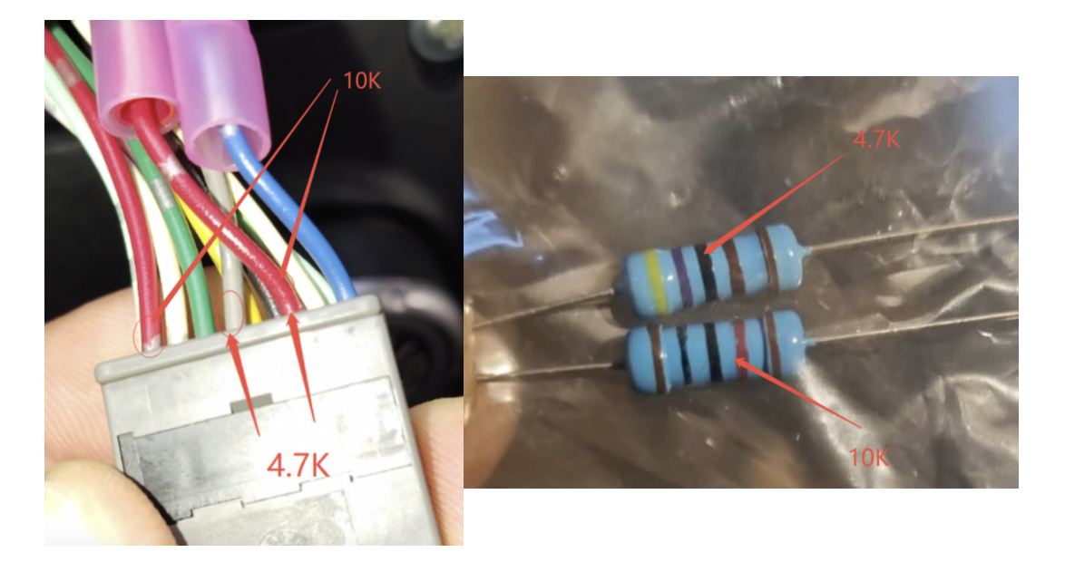 - Po instalaci autorádia je také potřeba zapojit 4.7K a 10K rezistory do konektorů kontrolky airbagů, aby došlo k vymazání chybové hlášky airbagů. Pokud se i zapojení rezistorů vyskytuje chybová hláška airbagů, pak je nutné tuto chybu diagnosticky vymazat.