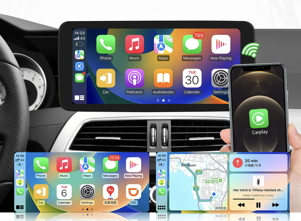 Bezdrátový Apple CarPlay a Android Auto umožňují pohodlné propojení chytrého telefonu s Android rádiem bez nutnosti použít USB kabel. Po spárování přes Bluetoothnebo Wi-Fi můžete ovládat navigaci, hudbu, hovory i zprávy přímo na displeji rádia pomocí dotyku nebo hlasových asistentů (Siri / Google Assistant). Funkce zajišťuje bezpečnější a komfortnější používání telefonu během jízdy.