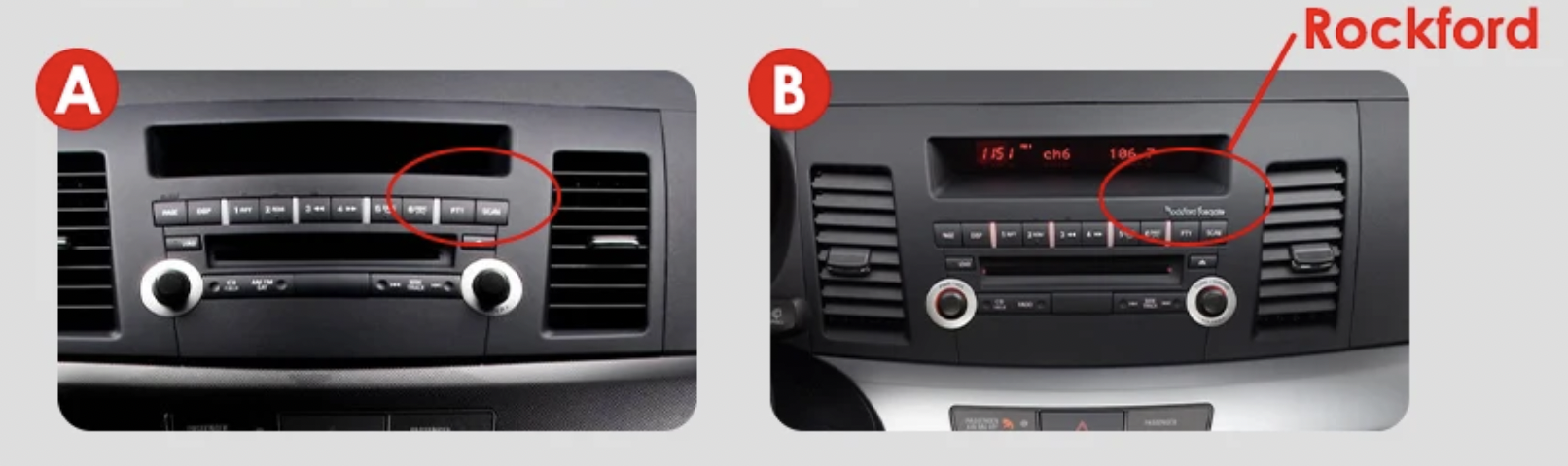 - Varianta B - pro vozidla s továrním RockFord zesilovačem - lze poznat podle nápisu "RockFord" na čelní straně továrního autorádia.