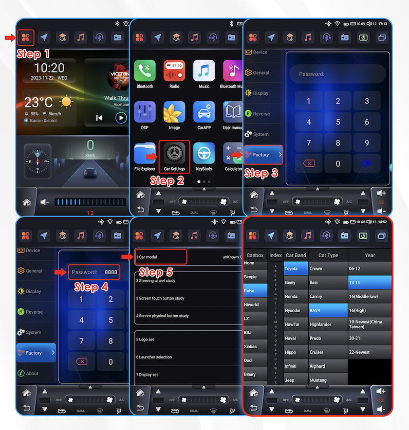 Pro komunikaci autorádia s vozidlem je nutné nastavit model vozidla podle obrázku.