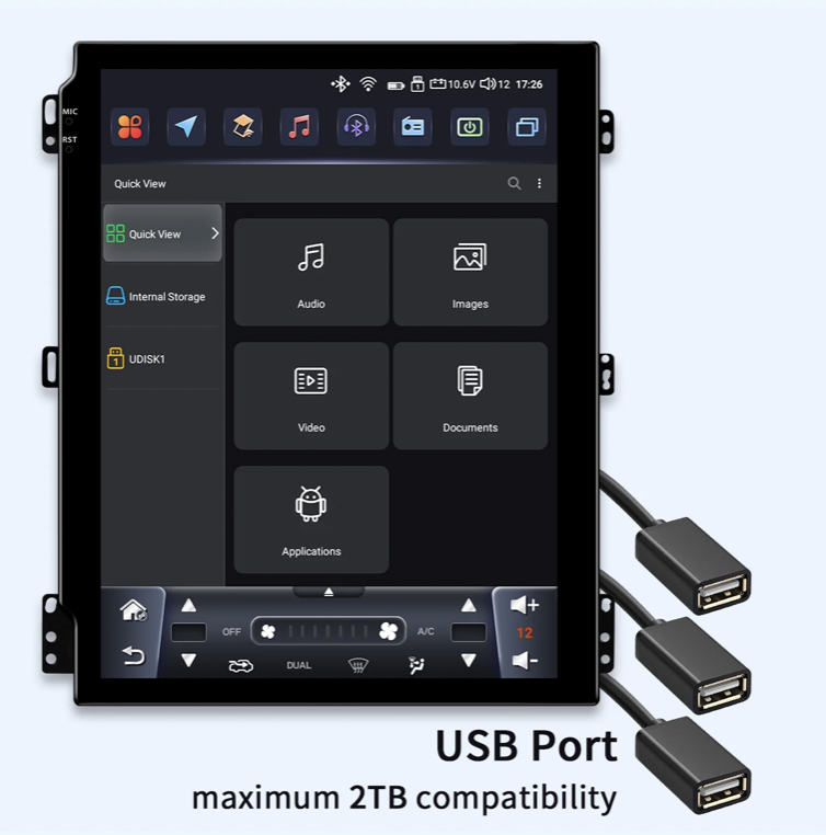 Zařízení disponuje celkem třemi USB vstupy vyvedenými pomocí kabelů ze zadní strany autorádia. Vstupy je možné následně vyvést na vámi preferované místo, jako je například přihrádka spolujezdce. Podpora externího úložiště až 2TB.