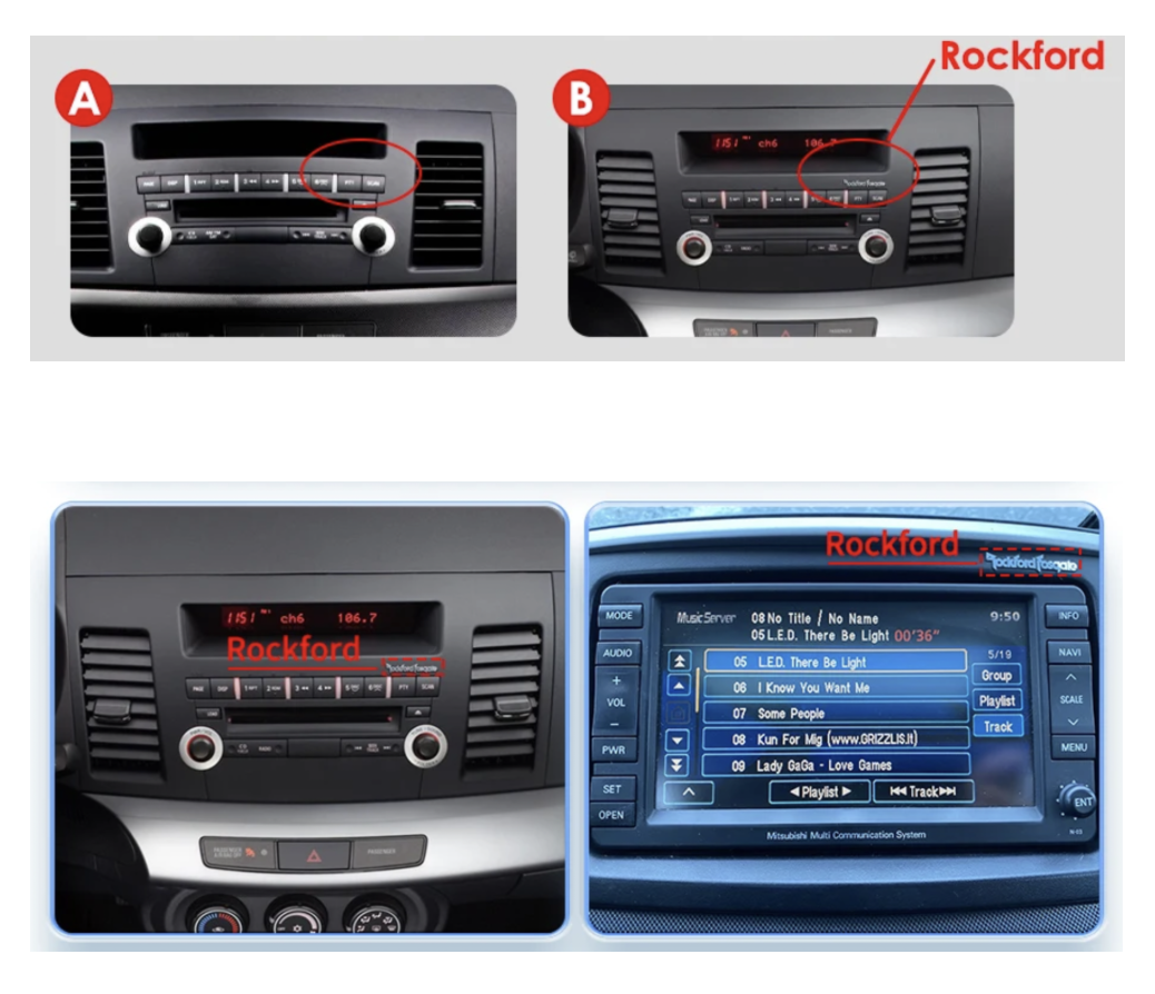 Varianta B - pro vozidla s továrním RockFord zesilovačem - lze poznat podle nápisu "RockFord" na čelní straně továrního autorádia.