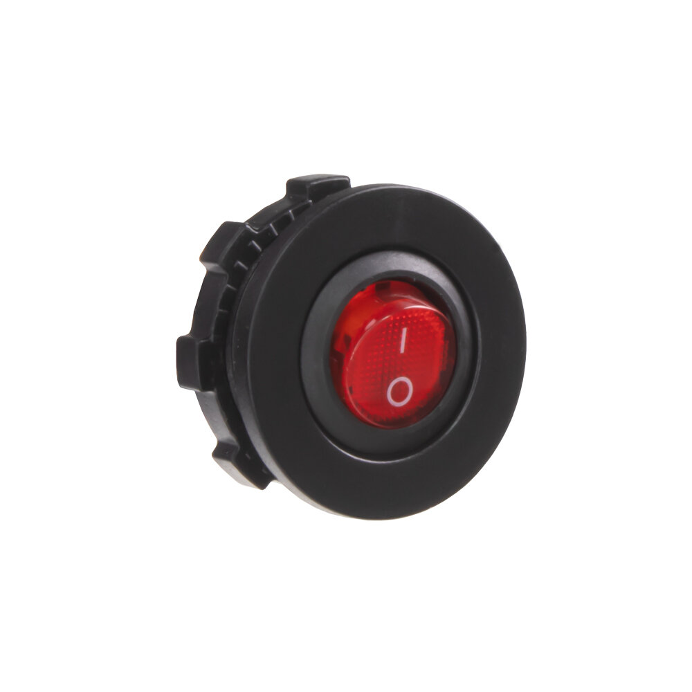 Spínač kolébkový kulatý 20A červený s podsvícením. Spíná kladné napětí mezi kontakty 1 a 2, na kontaktu 3 je kostra pro podsvícení.