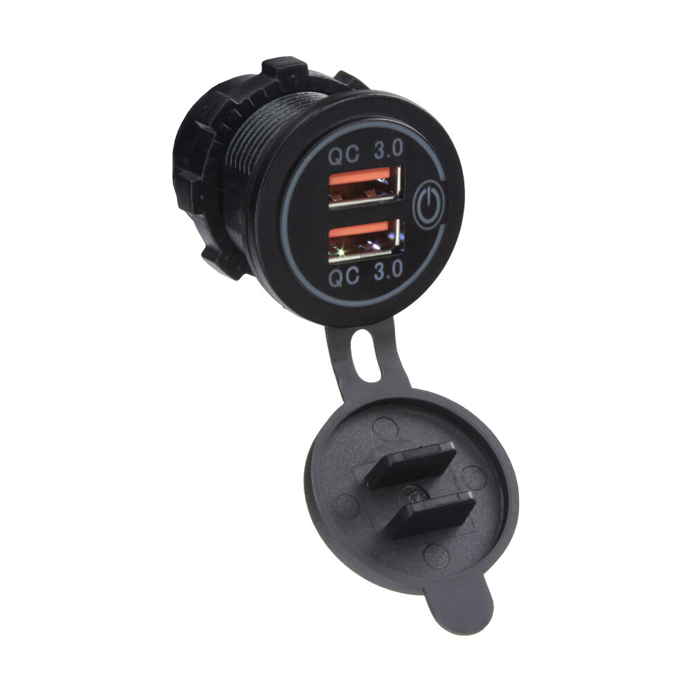 2x USB nabíječka do panelu, QC 3.0, s krytkou proti prachu a vlhkosti, bílé podsvícení a s možností vypnutí / zapnutí USB pouze dotykem.   Technické parametry: • napájecí napětí: 12 V / 24 V • funkce rychlonabíjení: QC 3.0 (Qualcomm Quick Charge 3.0) • výstup USB: 5 V - 12 V / max. 36 W • ø montážního otvoru: 29 mm • délka: 50 mm • ochranná krytka proti prachu a vlhkosti (lze sundat) • po připojení k napětí vždy ve stavu zapnuto • materiál: plast • bílé podsvícení • hmotnost: 29 g • včetně 2 ks …