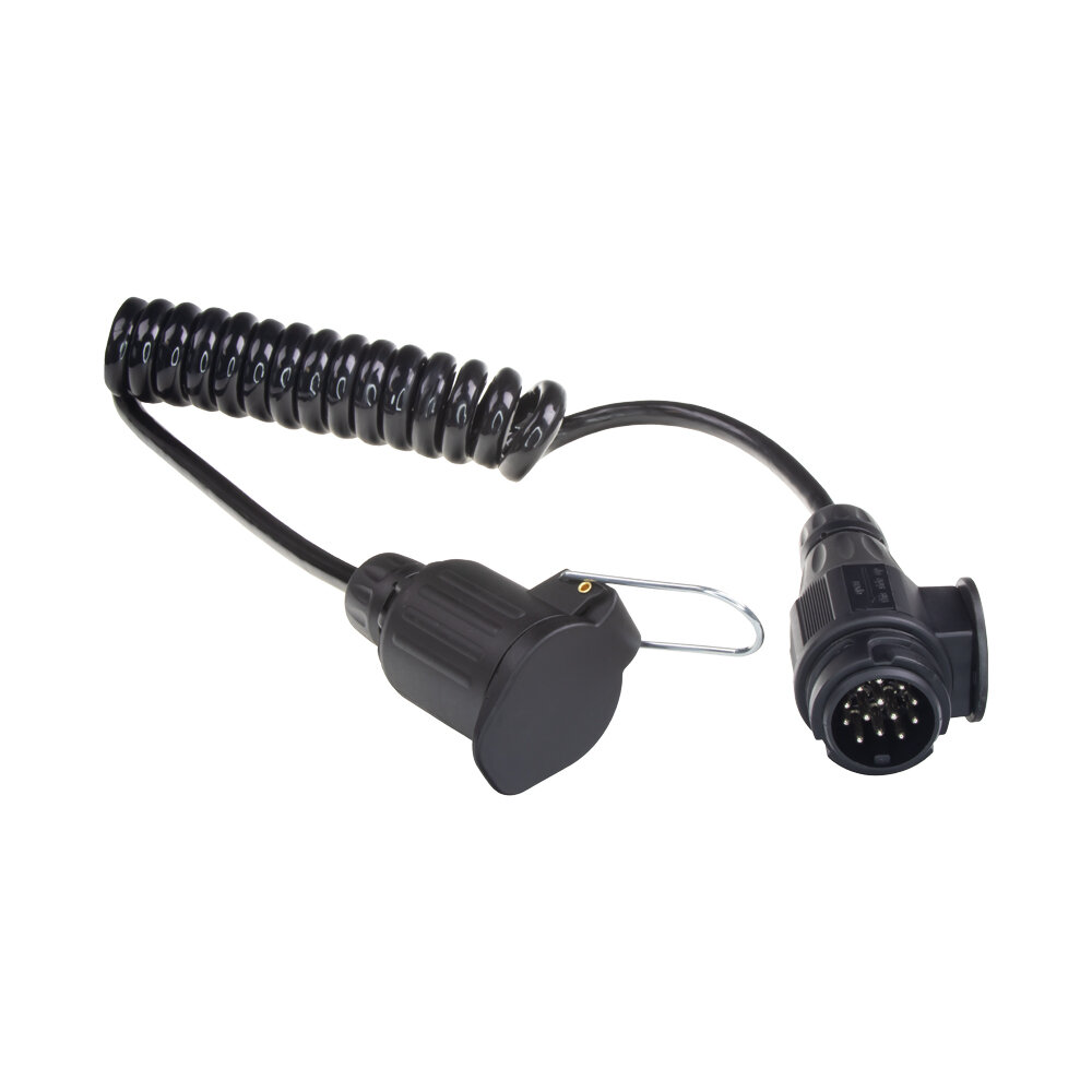 Praktický propojovací spirálový kabel zakončený 1x zástrčkou + 1x zásuvkou 13pin / 12 V.